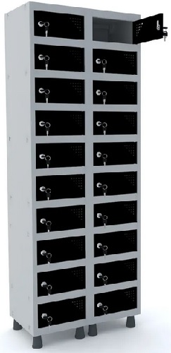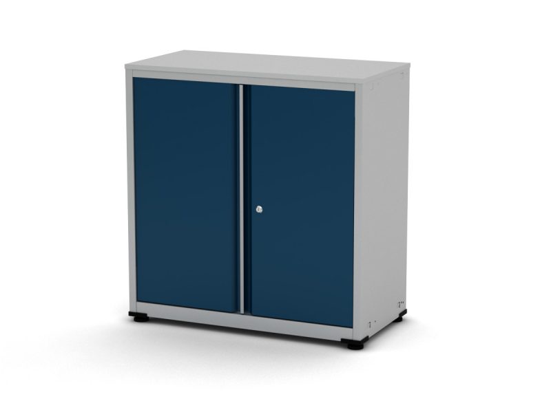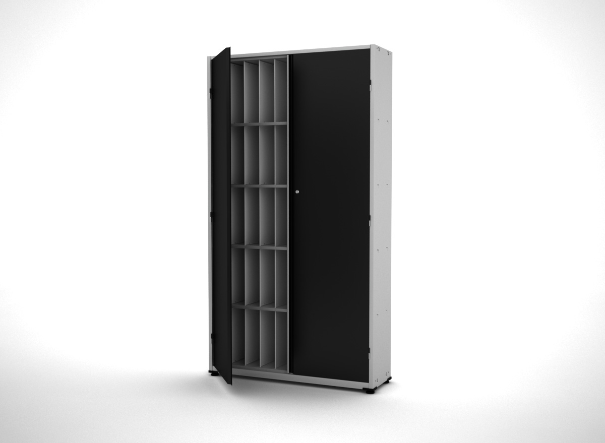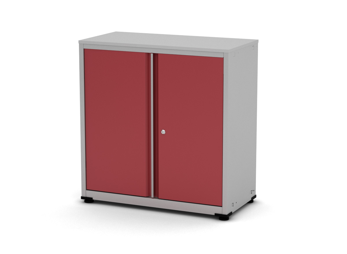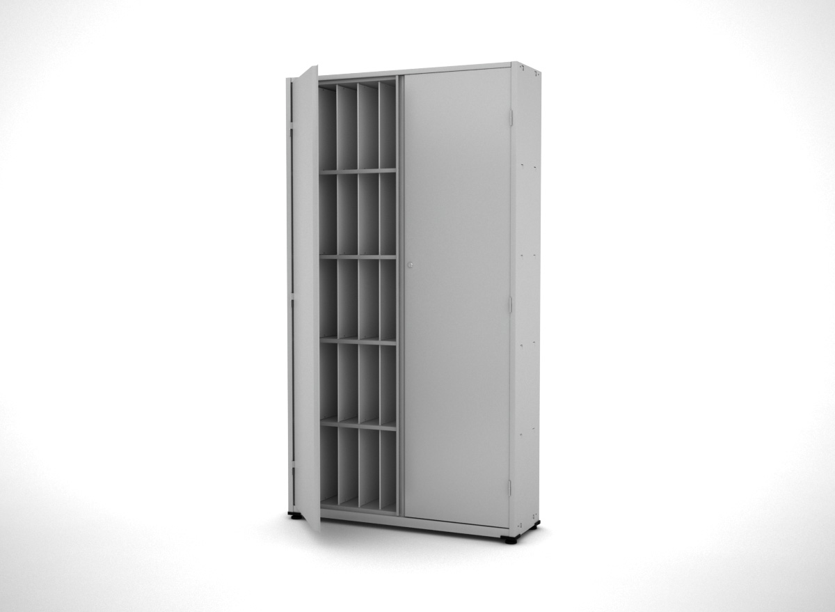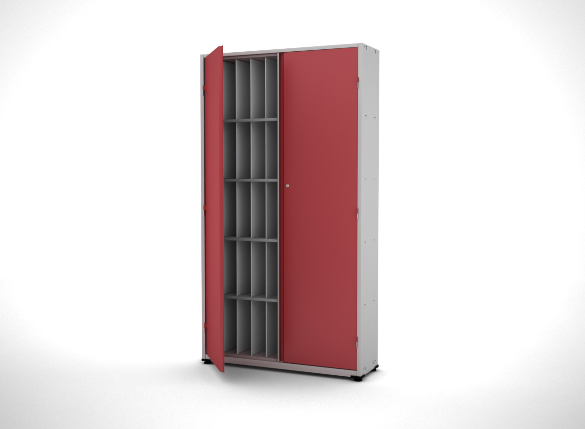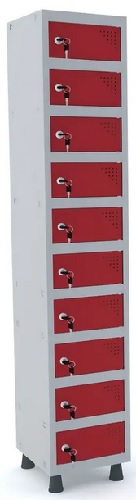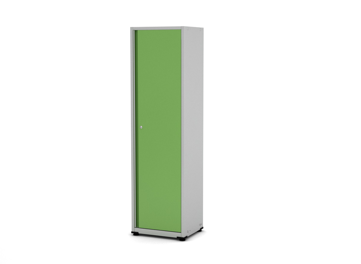 Armário de aço porta objetos, com pitão para cadeado ou fechadura, pés reguláveis e portas em diferentes cores.