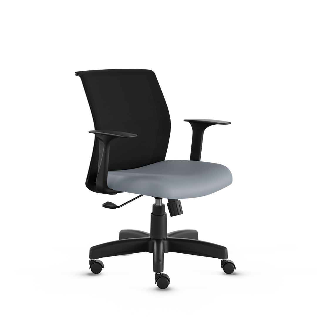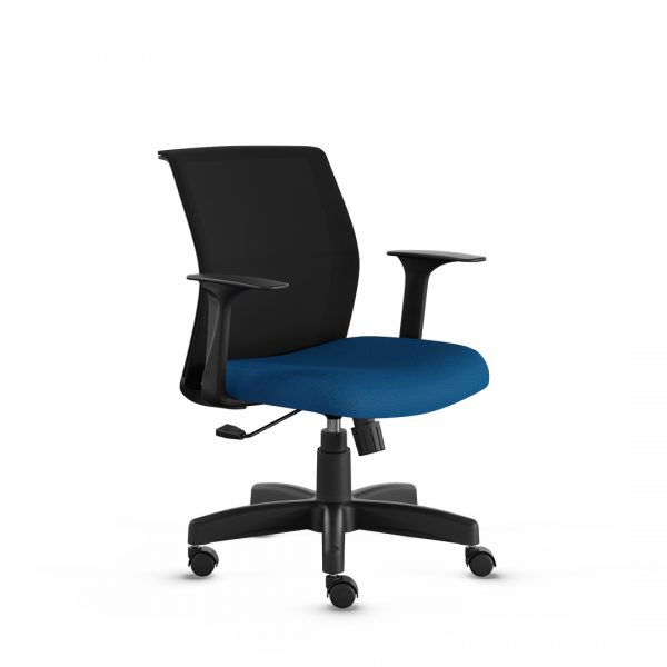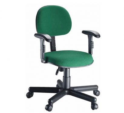 Base giratória preta com regulagem de altura à gás, regulagem de inclinação do encosto em diversas posições e regulagem de altura do encosto.